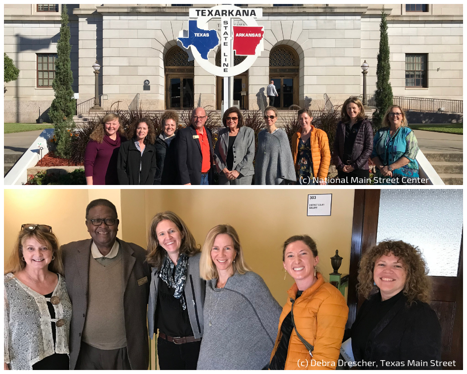 Photo credits: (Top, L-R) Marie Oehlerking-Read, Texas Main Street Project Designer; Ina McDowell, Main Street Texarkana Executive Director; Lindsey Wallace, Sr. Manager, Special Projects at the National Main Street Center (NMSC); Mayor Bob Bruggeman of Texarkana, Texas; Mayor Ruth Penney Bell of Texarkana, Arkansas; Mary Anthony; Gillian Lang; Patrice Frey, President and CEO of NMSC; and Debra Drescher, Texas Main Street State Coordinator.