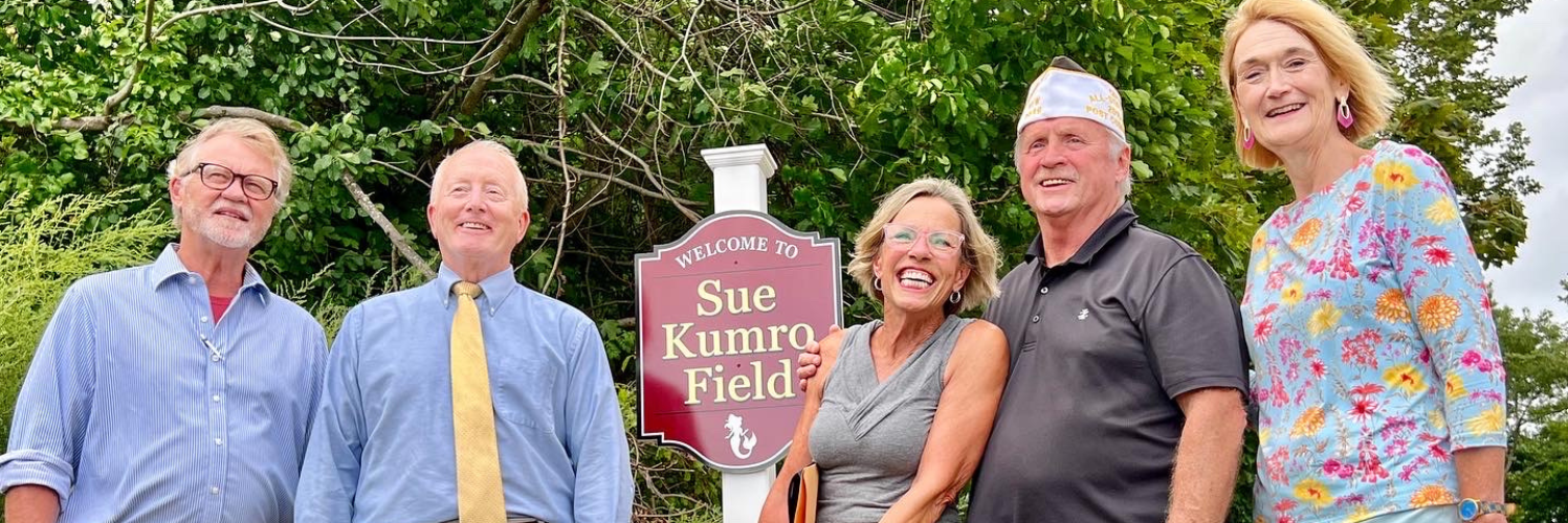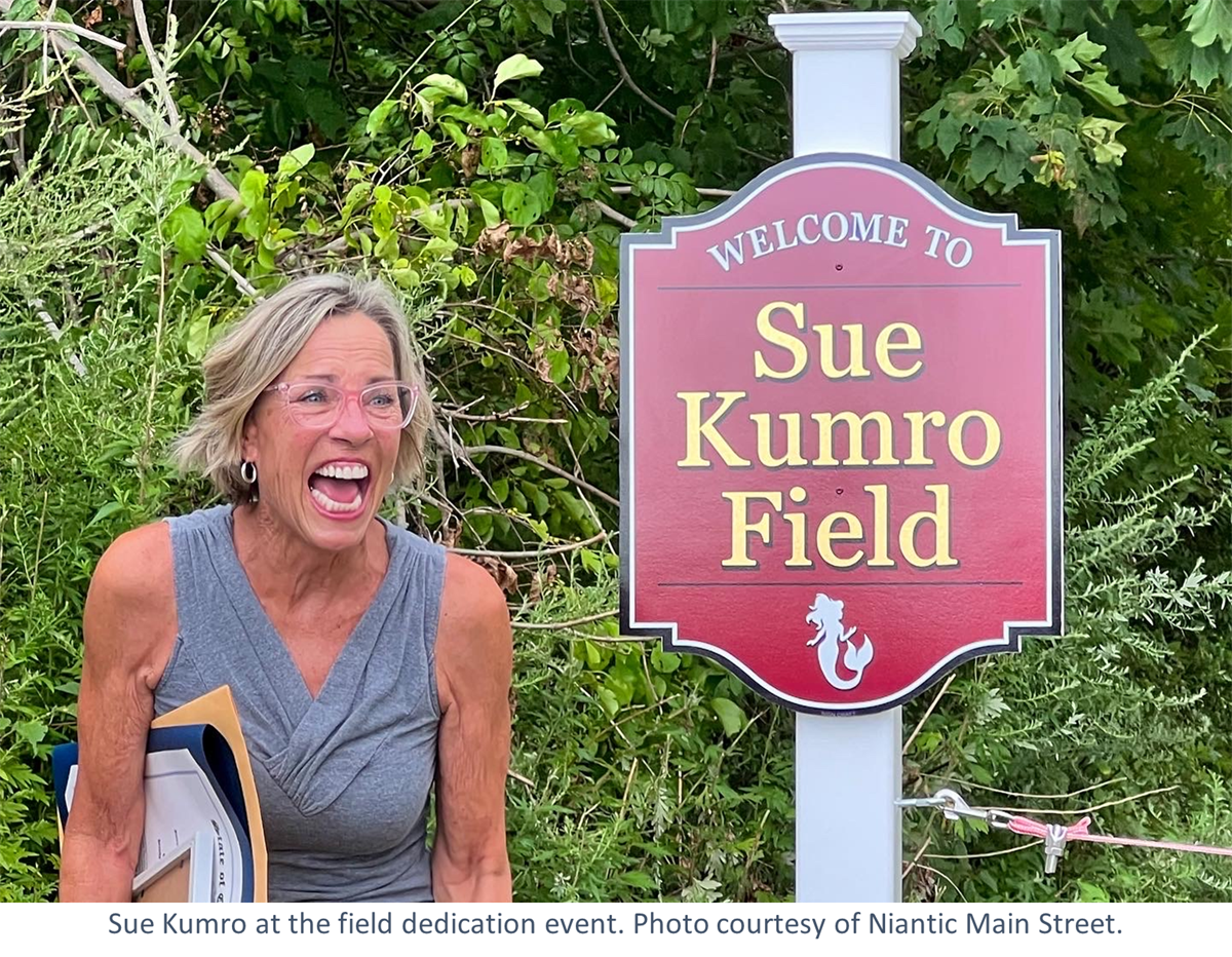 Last week, Niantic Main Street’s long-time board member and current Vice President Sue Kumro saw her many community contributions recognized with a field named in her honor. The field is located behind the Niantic Kari-Hill VFW Post 5849, known locally as the Niantic VFW. Since 2015, Sue has held a Cornhole Tournament as a fundraiser for the VFW.