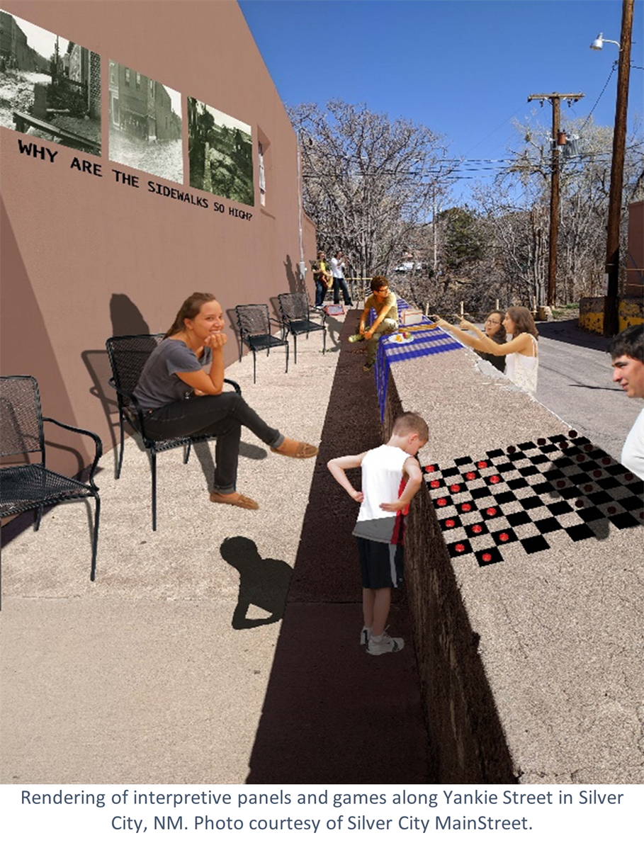 Silver City will use their AARP Funds to install interpretive panels along the sidewalks on Yankie Street. Summer “monsoon” rains often transform the street into “Yankie Creek,” and these historic rains also created Big Ditch Park. As a result of these frequent floods, the sidewalks are elevated to keep them above water. New residents and tourists often ask, “Why are the sidewalks so high?” This interpretive project will answer that question and provide activities that encourage use and exploration into the Big Ditch Park. The installation will also include locally popular games to engage all generations in social activity and access to the Big Ditch Park. “We are thrilled to receive this funding that will create a fun, engaging public space for residents and visitors of all ages,” said Charmeine Wait, Executive Director at Silver City MainStreet.