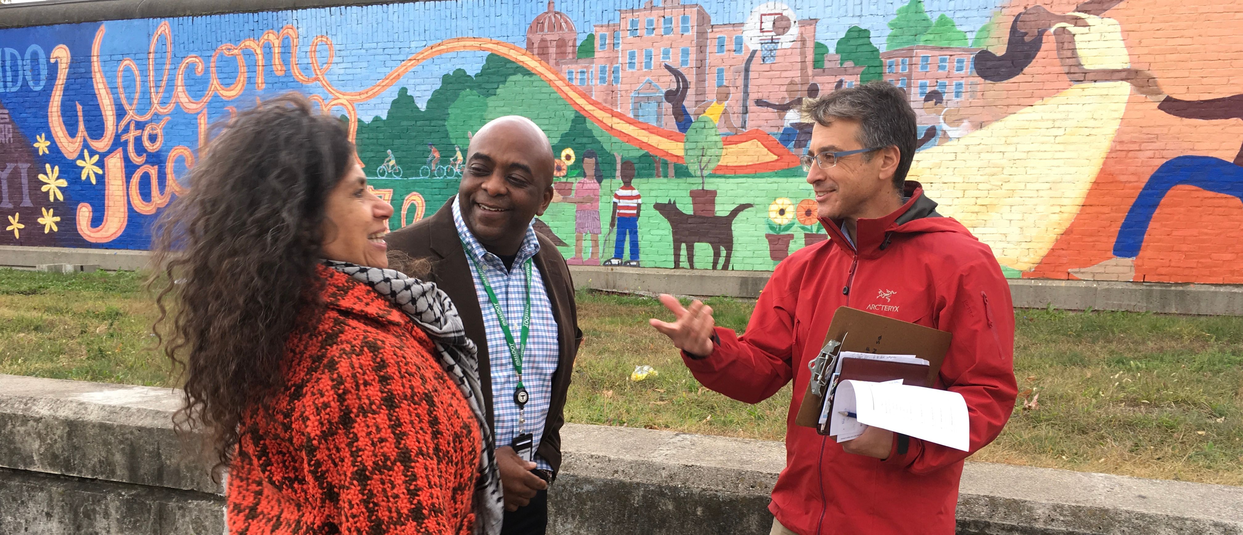 Artist Melissa Nussbaum Freemen, Drew Hall from the MBTA transit authority, and Gerald Robbins of Three Squares Main Street discuss Store-d Stories and permitting needs. (Photo credit: Three Squares Main Street)
