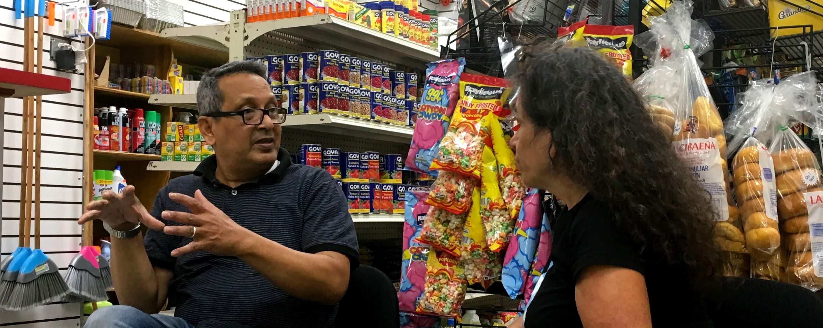 Momtaz Choudhury, owner of Codman Square Market, with Melissa Nussbaum Freeman discussing Store-d Stories project. (Photo credit: Three Squares Main Street)
