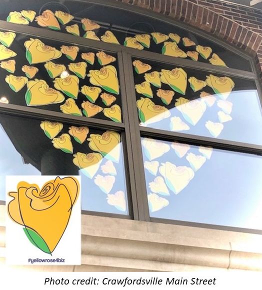 #YellowRose4Biz. The symbolism of the yellow rose has Crawfordsville Main Street in Crawfordsville, Indiana, ready to spread optimistic cheer. Symbolizing friendship, gratitude, and optimism, heart-shaped yellow roses have filled the second-floor windows of the downtown’s coworking space. “I want to help the small businesses downtown to know they’re supported and encourage them any way I can,” local artist Nina Cunningham, designer of the yellow rose symbol, said in a recent interview. Since this initial installation, the Main Street program has been offering both mosaic and single yellow roses available for free to downtown merchants. At the time of this writing, Indiana has opened retail stores and restaurant dining.