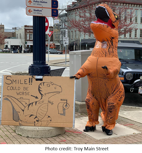 Dinosaurs on Main Street? Taking fun to a whole new epoch, Troy Main Street in Troy, Ohio, encouraged residents to visit downtown and wave hello to this friendly dinosaur spreading positivity along Main Street. Truly just delightful.