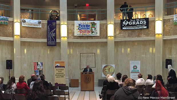 Former NMCMSC President Francis Bee of Gallup addresses the crowd at the MainStreet in New Mexico Day at the New Mexico State Capitol Rotunda