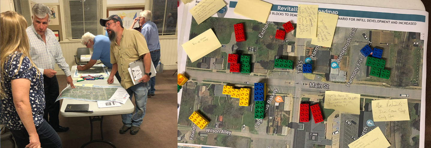 Left: Residents discuss a unified goal at a planning meeting. Right: A tactile public input exercise. Credit Downtown Redevelopment Services