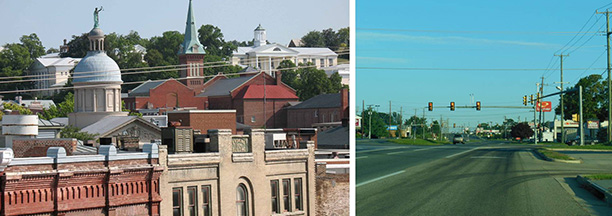Case in point, in the late 1990s a young couple from New Jersey was looking to buy a movie theater in a historic downtown. The husband took a train ride to Staunton to look at an available property. He stepped off the Amtrak train in downtown, walked up the street, and saw the theater. He was completely charmed by the historic downtown, and called his wife and told her he had found the perfect place. Their next visit was by car, when they drove along a two-mile commercial corridor, complete with chain stores and fast food restaurants, into town. He has since said that if he had arrived by car the first time he wasn't sure he would have reached downtown, much less have bought and renovated the theater!