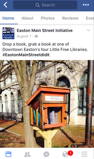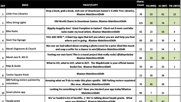 Fortunately for us, Easton Main Street Volunteer, Tracey Werner, President of Blabbermouth Communications specializes in Social Media Marketing. She helped us to refine our campaign and offered to get the word out by coordinating posts across Facebook, Instagram, and Twitter for the entire month. Our Organization Committee had the gratifying task of brainstorming dozens of our biggest, most popular, and most crowd pleasing projects that we felt the community would benefit from knowing that we were behind. We dug through all of our notebooks and picked the brains of Kim and Amy, our awesome Main Street Managers to come up with a strong list. We wrote copy for each of the posts and Amy gathered all of the accompanying photo assets. We laid out every post across the month of August in an effort to marry our achievements (humblebrags) with relevant events scheduled around town during that period. With fingers crossed, we handed it all off to Tracey. Not only did she curate our posts across three platforms, she engaged in real-time with our followers, live-tweeted events, and added her personal flair, marketing know-how, and love of the city to each day’s postings.