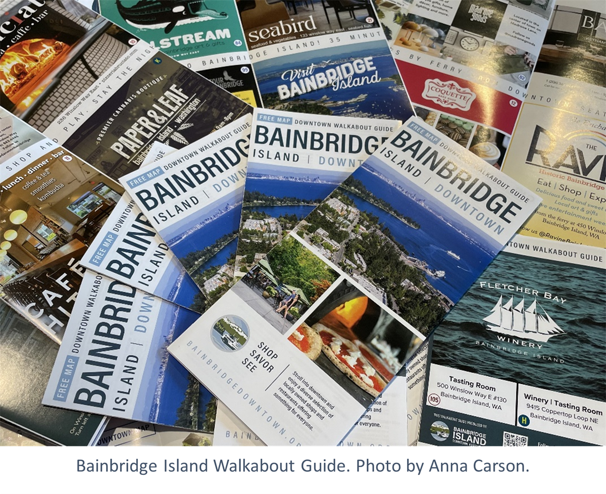 We developed our Walkabout Guide to help visitors navigate the Main Street district by foot. This guide dovetails nicely with BI Ride, a new pilot program developed by Kitsap Transit that allows for visitors and locals to have the option to be “carefree and car free.” The on-demand bus service runs morning through mid-afternoon when routed buses are not running, getting people almost anywhere on Bainbridge Island. Riders can hop on at timed slots or book a ride using an app at an affordable $2.00 or less per ride.
