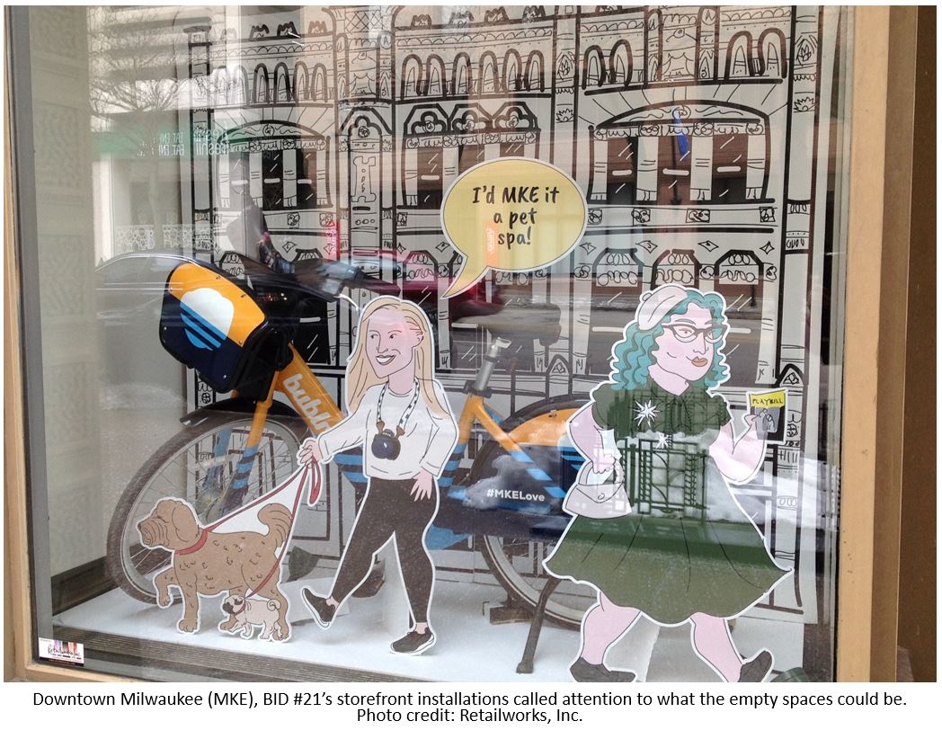 “Activating vacant storefronts has proven to be a great utilization of our resources,” said Beth Weirick, CEO of Downtown Milwaukee, Business Improvement District #21, who recently had great success with an empty storefront installation. Working in collaboration with Retailworks, Inc., Downtown Milwaukee BID #21 transformed 17 windows at four downtown properties into eye-catching displays. These storefront installations called attention to prime real estate space as well as entertained passersby with illustrations of historic downtown buildings and vignettes of different kinds of businesses that could work well in the spaces.