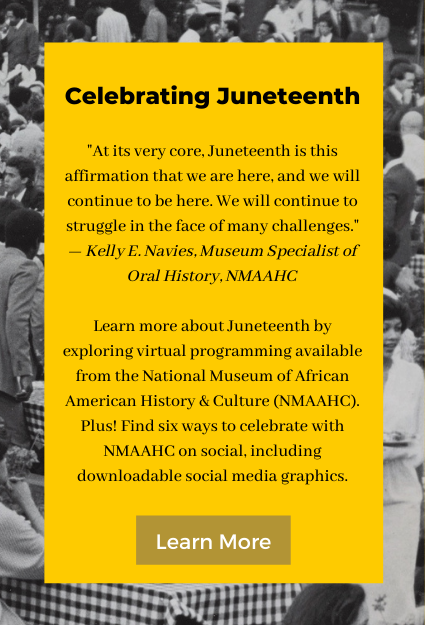 Learn more about Juneteenth by exploring this virtual programming from the National Museum of African American History & Culture. Not sure how to honor the day in your community? Start by sharing these downloadable social media graphics!