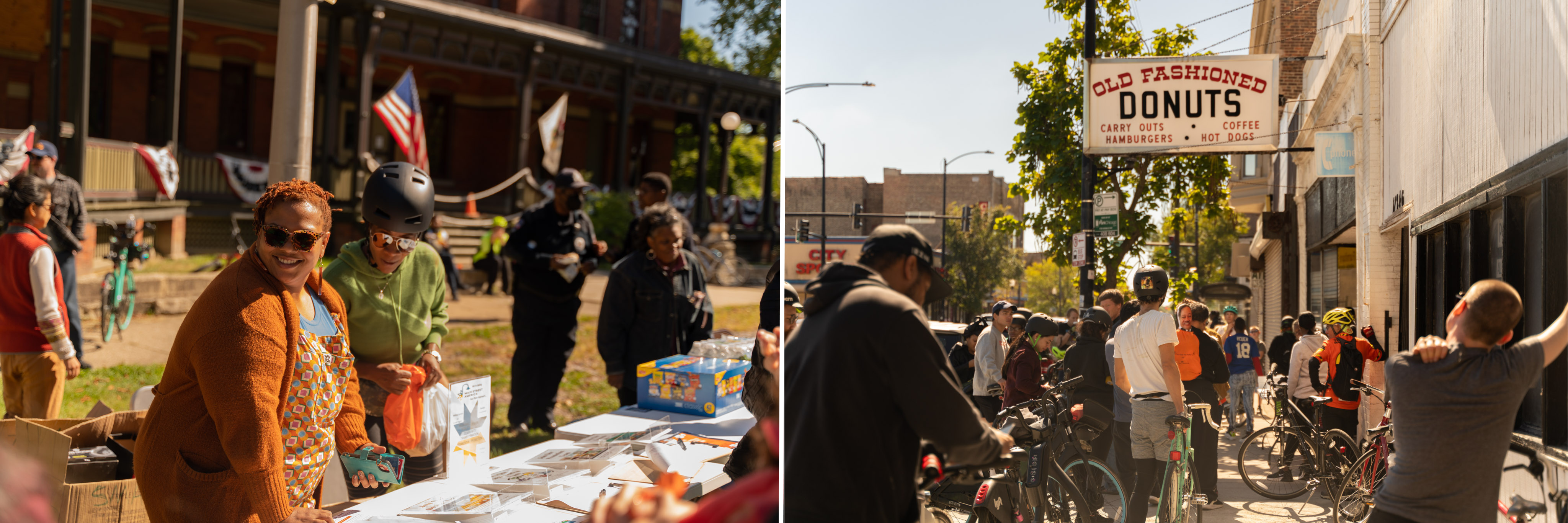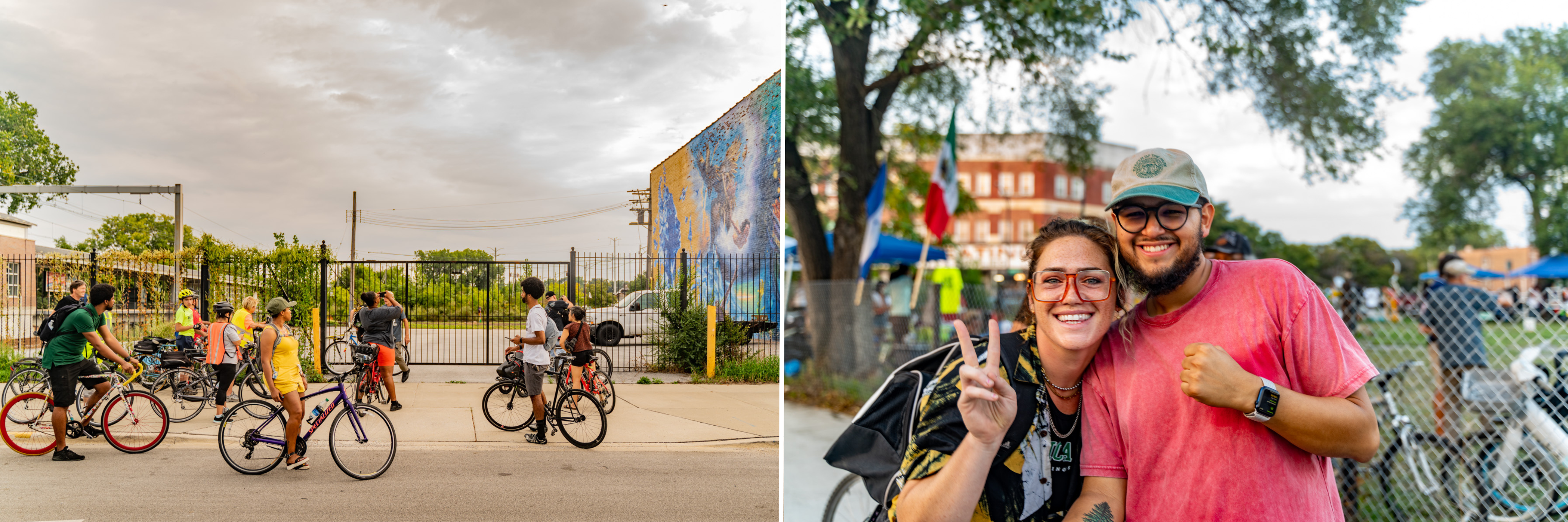 Left: Stopping to enjoy a mural in South Chicago. Right: Connecting with residents before riding out. Credit: Oscar Sanchez.