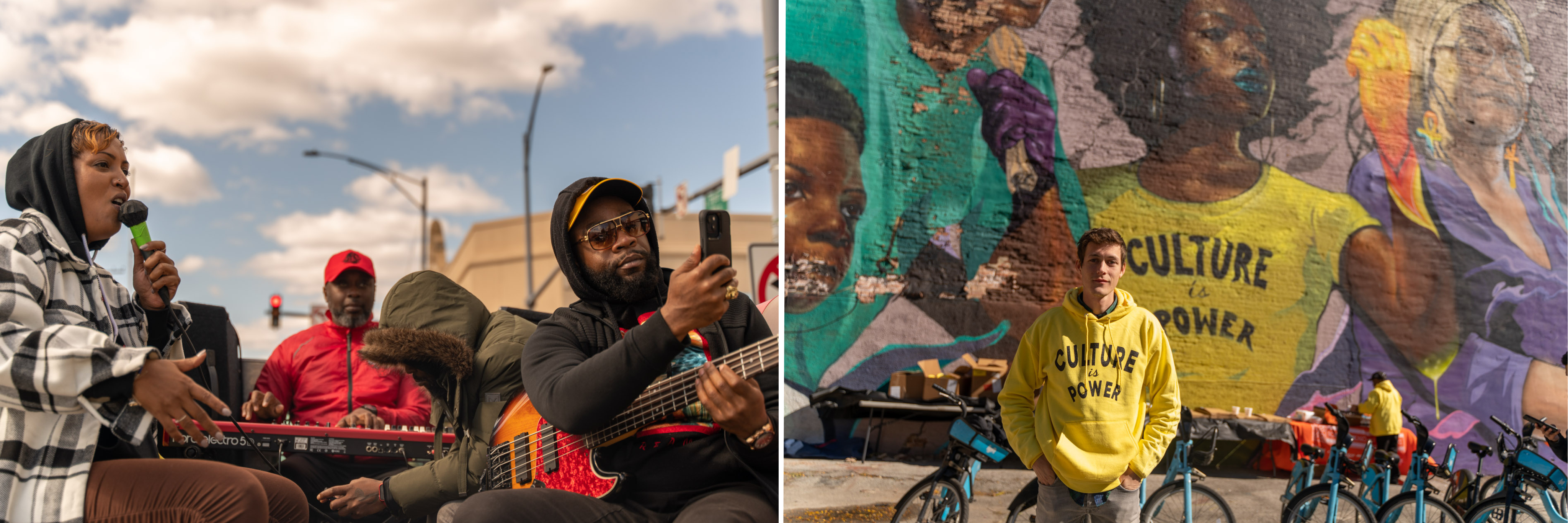 Left: New Black Renaissance band providing a soundtrack for the ride in Avalon Park and South Shore. Right: A ride participant and community supporter stands in front of a community mural. Credit: Oscar Sanchez.