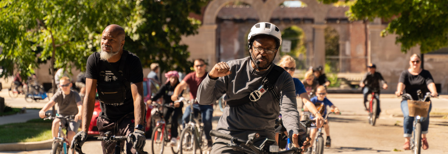 Equiticity founder, Oboi Reed, leads a community bike ride in Chicago’s Pullman neighborhood. Credit: Oscar Sanchez.