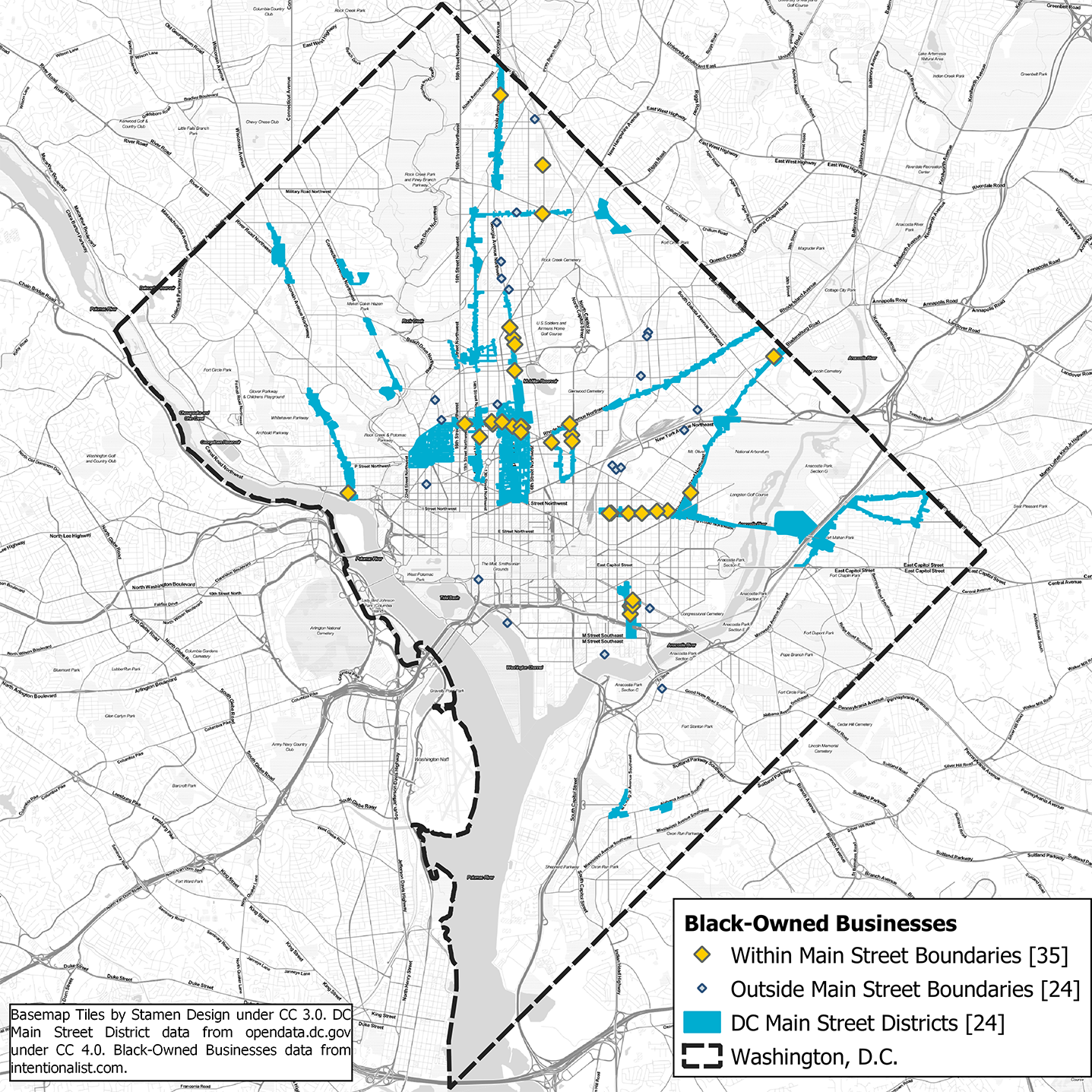 It seems likely that some Main Street programs have much higher rates of Black business ownership than the three or six percent national rates of respondents in our surveys. To test this, we mapped and analyzed the locations of Black-owned businesses listed on Intentionalist.com, an online guide for intentional spending, alongside the locations of Main Street districts in Washington, D.C. Of the 59 Black-owned businesses in D.C. listed on Intentionalist.com, 35 are located in Main Street districts—59 percent of the total for the District.
