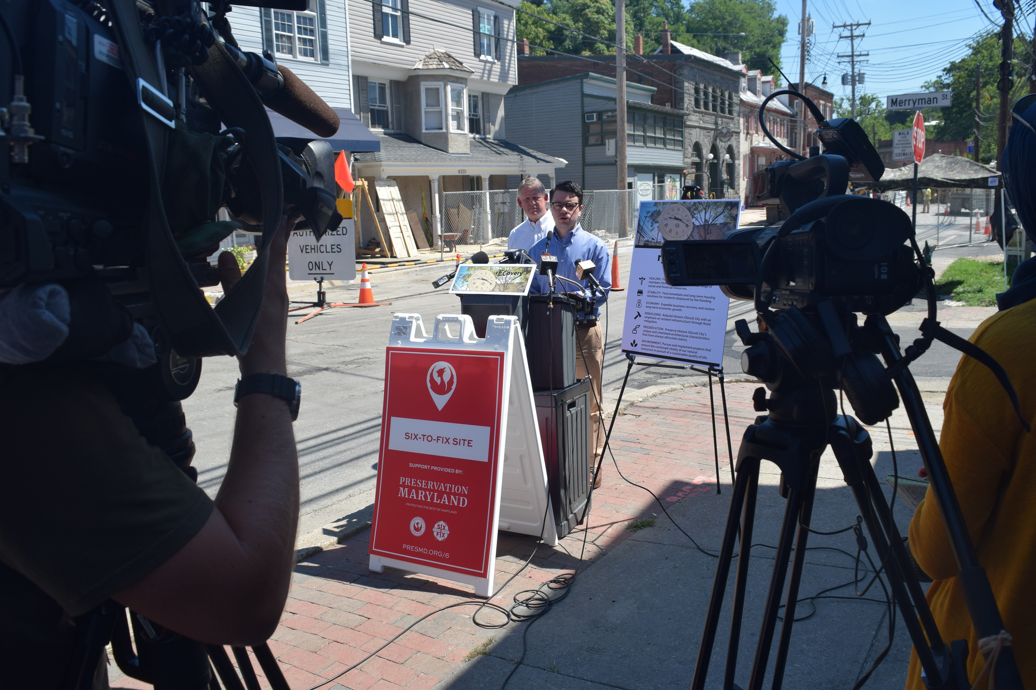 Ellicott City Recovery Press Conference, Nick Redding | Preservation Maryland Executive Director Nick Redding speaking at a press conference on the restoration and rehabilitation of Old Ellicott City. Howard County Executive Allan H. Kittleman stands behind him.