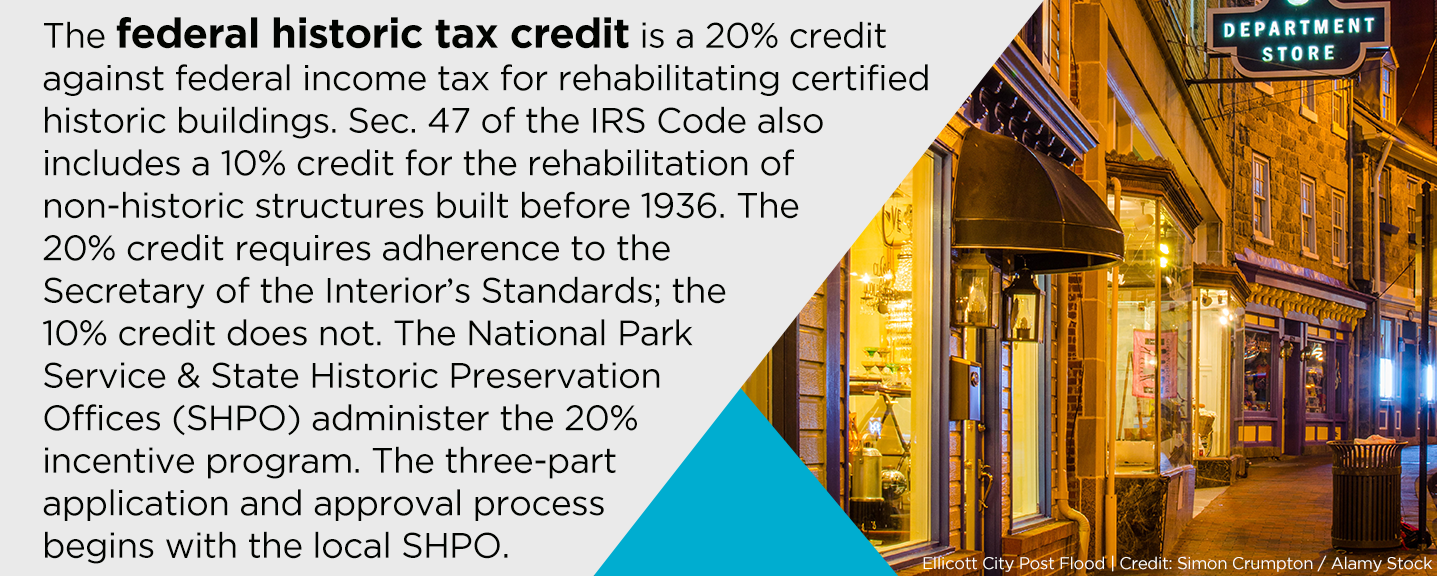 The Ellicott City story provides insight into what changes to the federal HTC might have helped a greater number of property owners. Current legislation with broad Senate and House support, the Historic Tax Credit Improvement Act or HTCIA (HR 1158 and S 425), would make several overdue changes to the federal HTC that would address many of the barriers Main Street property owners like those in Ellicott City face when considering the use of the federal HTC. Achieving a better balance between urban and small town locations and large and small transactions are the heart of the HTCIA legislation. Key provisions include: