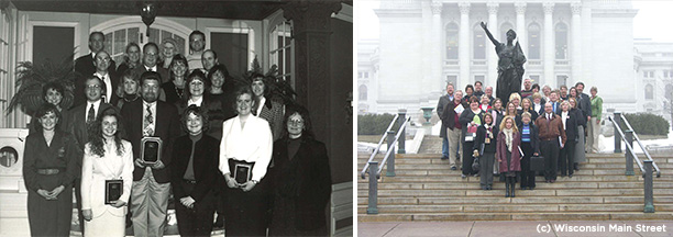 (L) Local Wisconsin Main Street Directors from the early 1990s; (R) Main Street Directors from around Wisconsin, posing in front of the state Capitol.