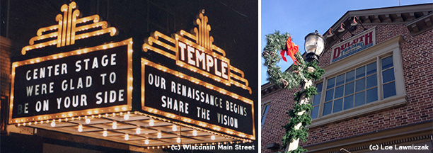 (L) The restored marquee of the Temple Theater in Viroqua. The theater restoration was one of the best in the history of Wisconsin Main Street; (R) The recruitment of Duluth Trading Company to downtown Port Washington has been a catalyst for further development.