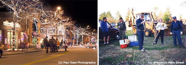 (L) The Broadway District in Green Bay after many successful years practicing the Main Street Approach; (R) Some of the dedicated volunteers of Tigerton Main Street, population 764.